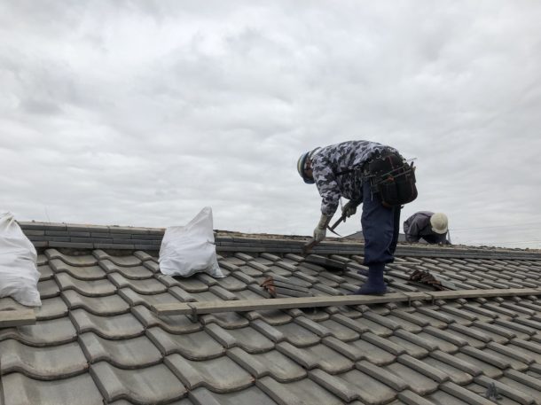 瓦はいったん撤去し、漆喰を新しくしてまた既存のものを元の位置へ戻す作業です。